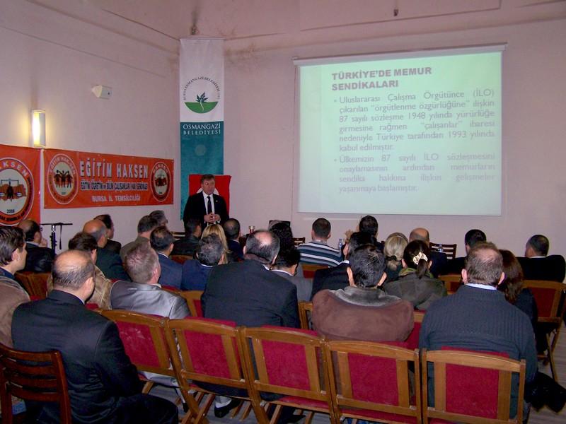Konfederasyonumuzda ve üye sendikalarımızda görev alan genel merkez ve şubelerin yönetim, denetim ve disiplin kurulu üyeleri ile kurum, bölge, il, ilçe ve işyeri temsilcilerinin sendikal anlamdaki bilgi ve becerilerinin artırılması amacıyla kurulan HAKSEN Sendika Okulunun eğitim programının ikincisi 21 Ocak 2012 Cumartesi günü Bursa’da yapıldı.