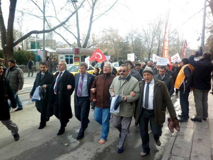 Adalet Bakanlığı önünde toplanan Büro Hak-Sen üyesi yargı çalışanları, ayakkabılarını çıkararak altına “Adalet yaya kaldı” yazdılar. “Yargıda adalet, adalette sefalet”, “Fazla çalışma hakkımız, söke söke alırız” sloganları atan grup adına Haksen ve Büro Hak-Sen Genel Başkanı Ayhan Çivi bir açıklama yaptı.