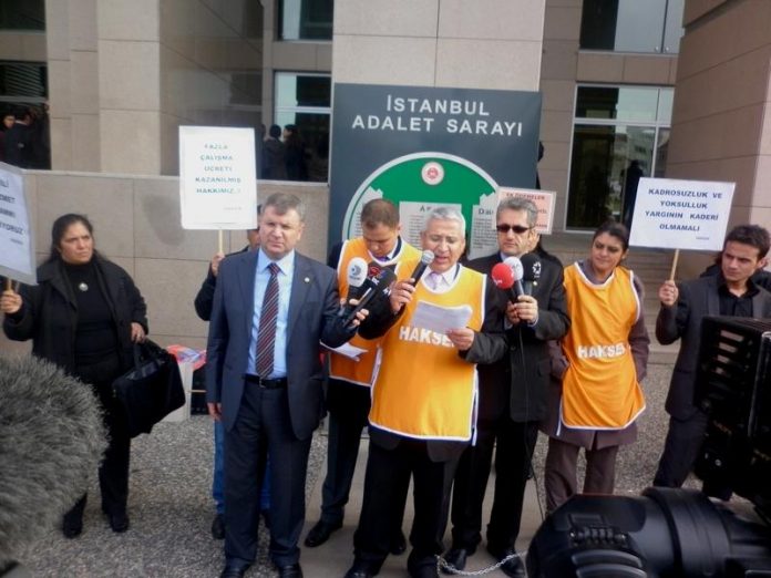 Şu anda bir “adalet sarayının” önünde bulunuyoruz. Sadece adalet saraylarının yapılması sorunları ortadan kaldırmıyor. Tam tersine yargı çalışanlarının yeni mağduriyetlerle karşılaşmasına neden oluyor. Yargı çalışanlarına saraydaki köle muamelesi yapılmaktadır.