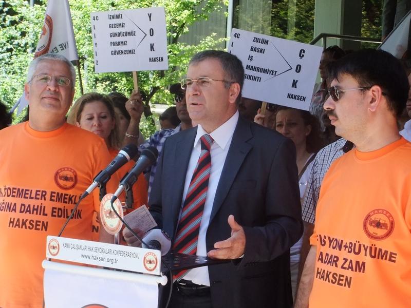 Haksen Genel Başkanı Ayhan Çivi , üyelerin katılımı ile yapılan eylemde konfederasyonun toplu sözleşme masasında hükümetten taleplerini açıkladı.