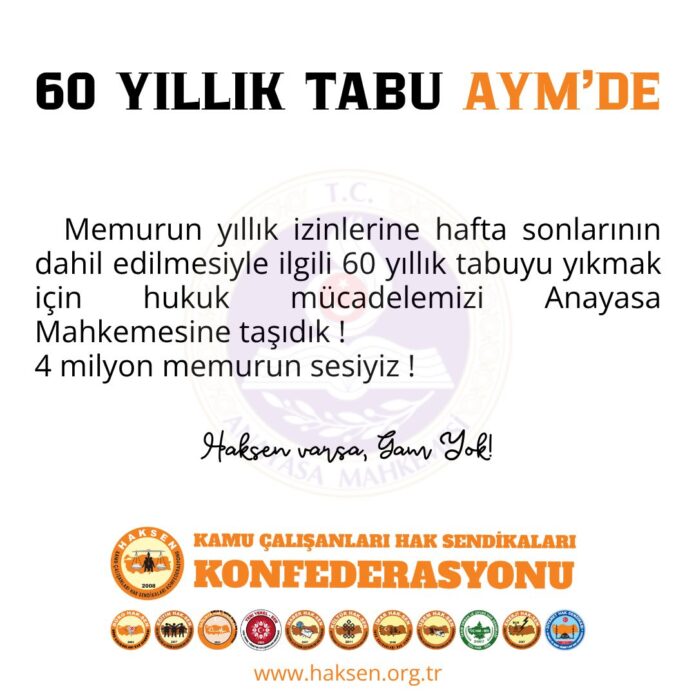 HaberlerManşet Haberleri 60 Yıllık Tabuyu AYM’ye taşıdık ! Yazar haksen - Aralık 9, 2025 FacebookTwitterPinterestWhatsApp Memurların aldığı yıllık izinlere denk gelen hafta sonlarının izinlere dahil edilmemesi için sendikamız tarafından açılan davanın idari yargıda olumsuz sonuçlanması nedeniyle Anayasa Mahkemesine bireysel başvurumuz yapılmıştır.