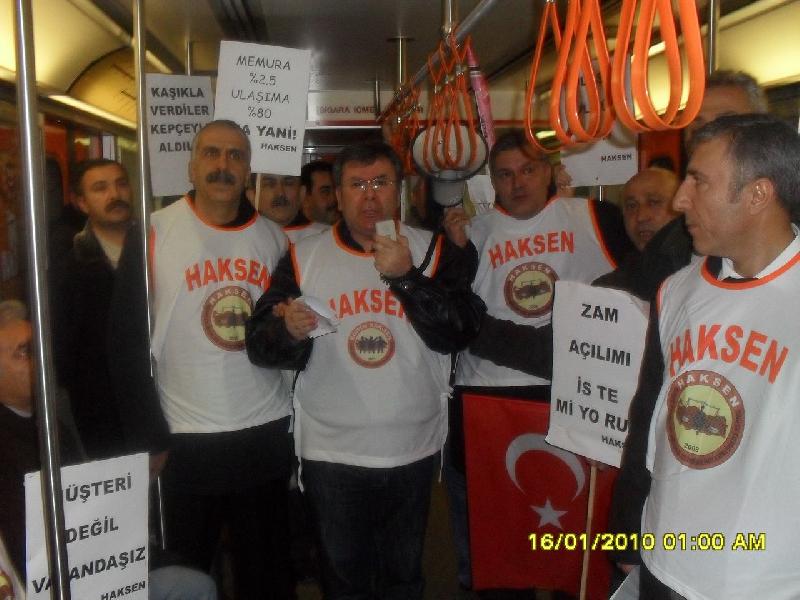 16 Ocak 2010 Cumartesi günü Ankara Metrosu yolcu bindirme peronunda bir araya gelen üyelerimiz , güvenlik görevlilerinin engelleme çabalarına aldırmadan perona yanaşan trene bindiler. Basın mensupları da üyelerimize eşlik etti. Trenin hareket etmesinin ardından basın açıklaması yapan Haksen Genel Başkan Ayhan Çivi’nin konuşması sık sık sloganlarla kesildi. Üyelerimizin bulunduğu vagona duraklarda yolcuların girişinin güvenlik görevlilerince engellenmesine vatandaşların büyük tepki göstermesi üzerine Genel Başkan Ayhan Çivi, madem söylediklerimizin duyulmasını istemiyorsunuz , o halde zammı neden yaptınız diyerek görevlileri uyardı.